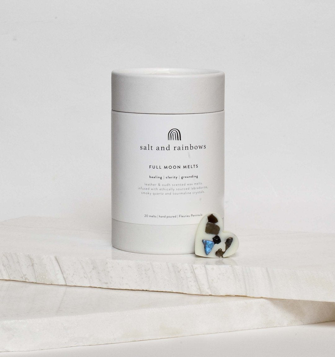 All our melts are hand poured in our Fleurieu Peninsula studio and crafted with a soy wax blend, charged crystals, and a carefully curated fragrance. We ensure that each crystal is infused in the wax before finding their home in your melts to give you the maximum benefit of their energy.