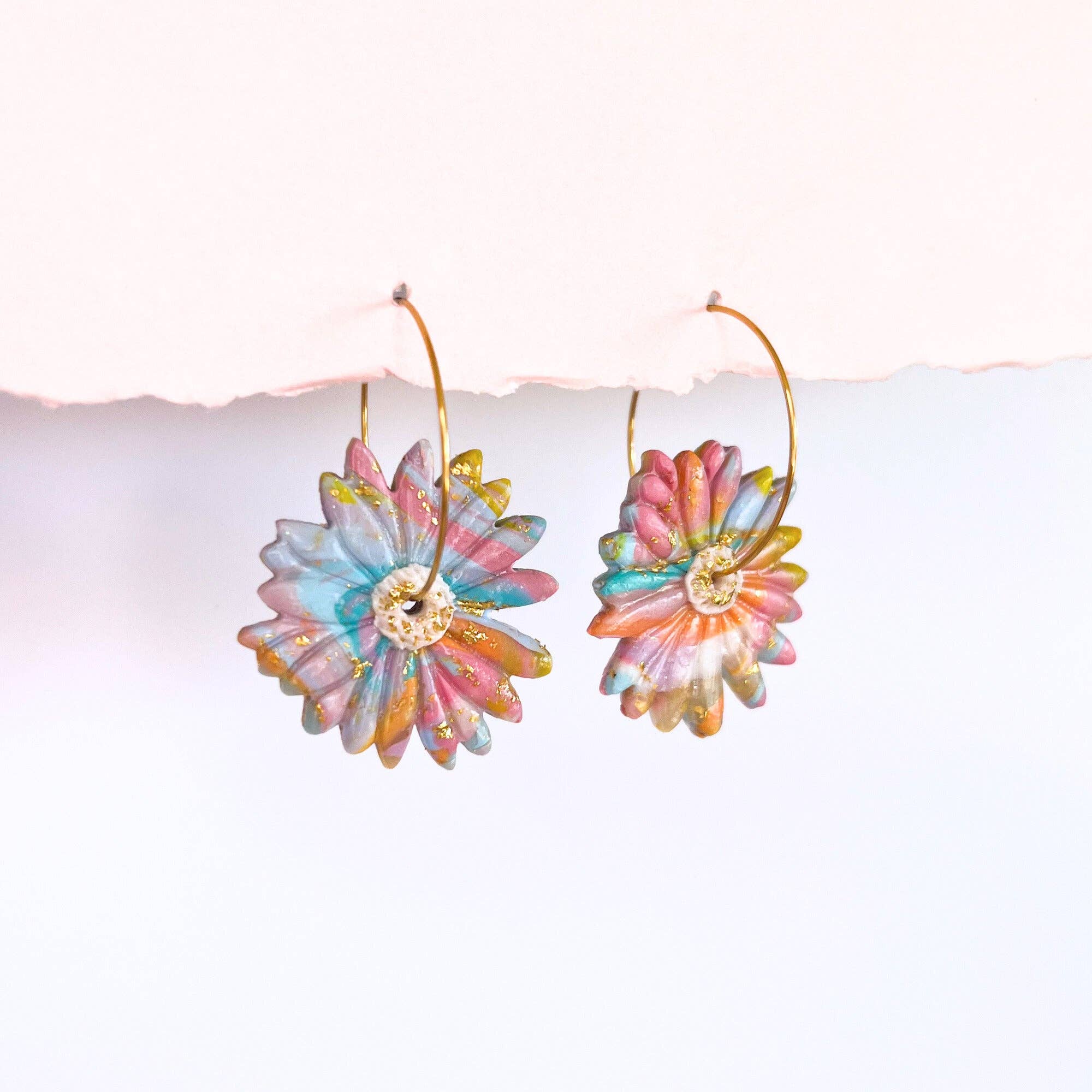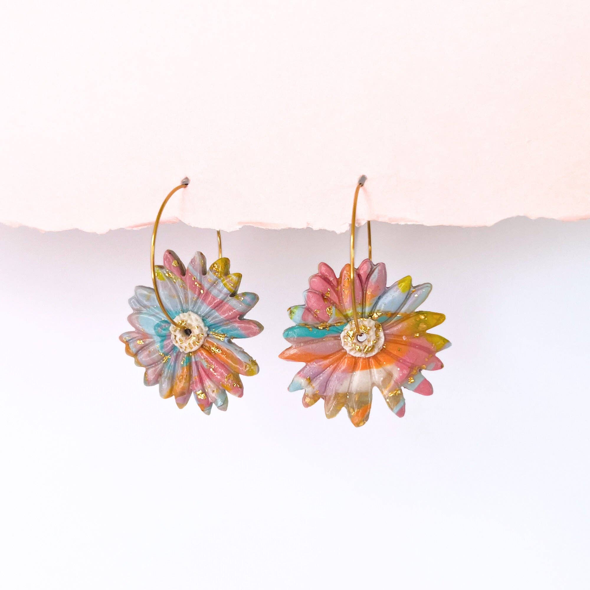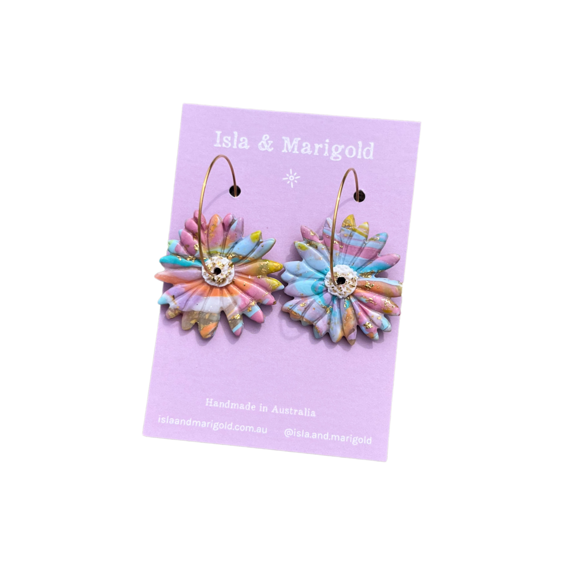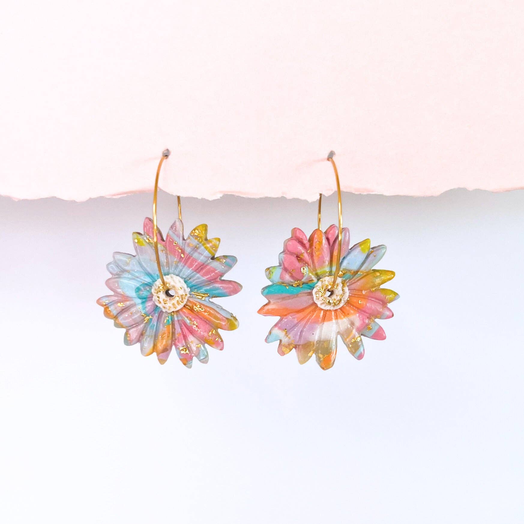 Add a stunning pop of colour to any outfit. Beautiful rainbow flower feature on a large simple hoop.
