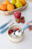 This kids cutlery set supports children as they transition from assisted feeding to self-feed