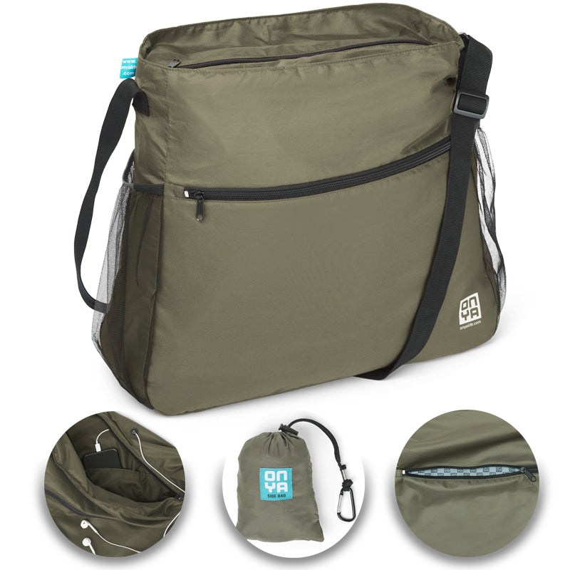 Ethically made from recycled plastic drink bottles, this durable Side Bag makes a perfect day bag and stuffs down into a fist-sized carry pouch so you can take it with you anywhere, anytime.