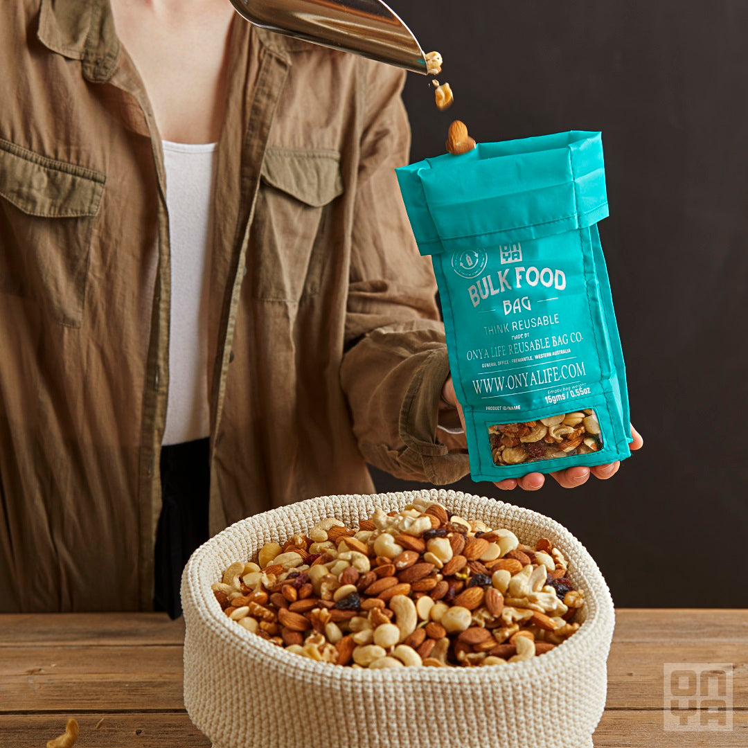 It is also super handy to use when you would like to top up half filled containers at home. This means you no longer need to stock up on extra jars and containers on top of your current ones to use as “top up” containers, as all our bulk food bags give you a light and compact way to top up as you need.