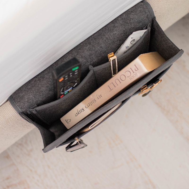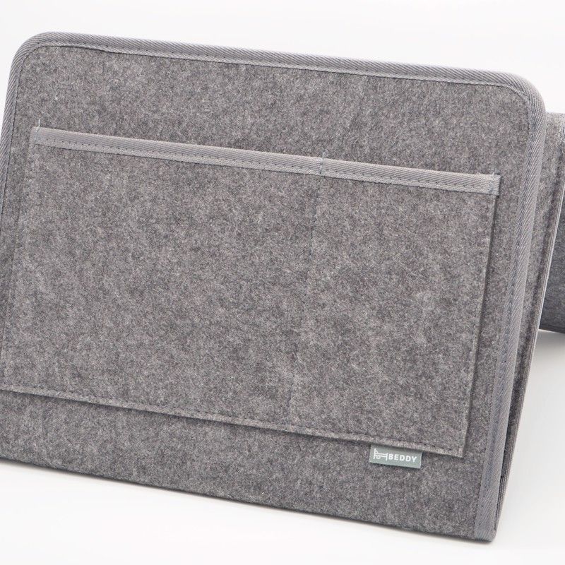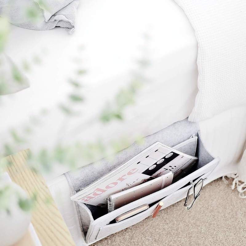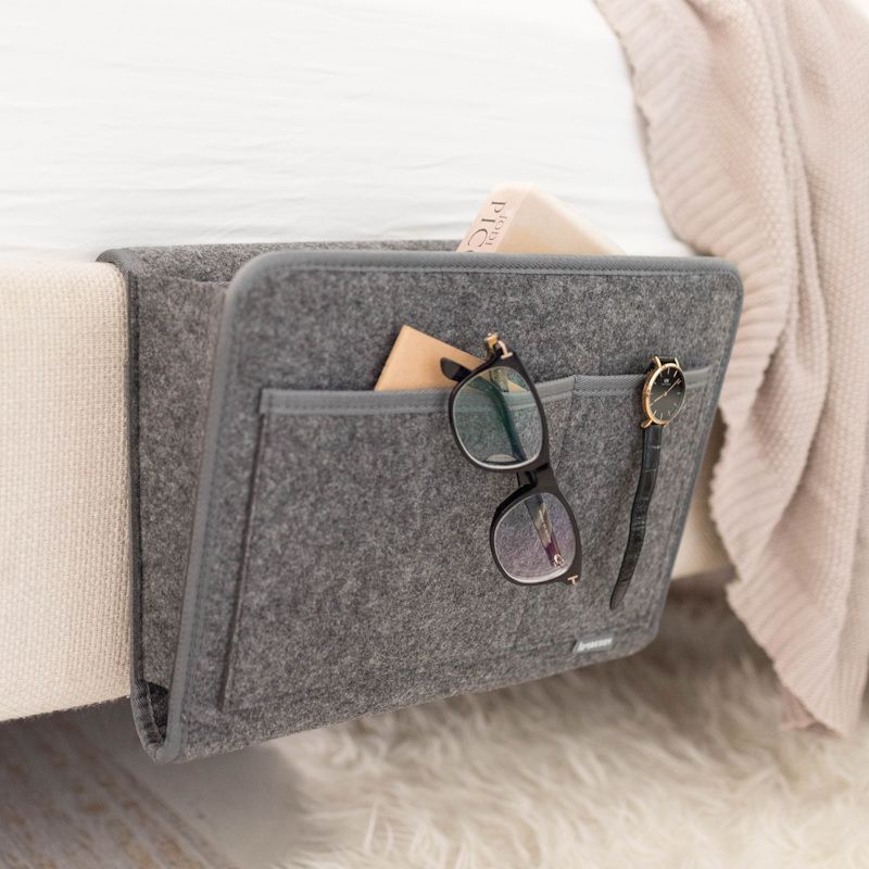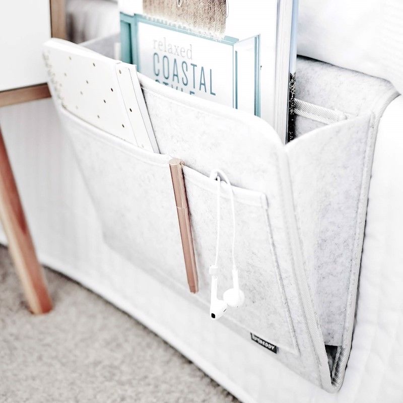 Beddy bedside caddy is an innovative felt pocket organizer for your bed. It conveniently stores all your essentials beside you. Never worry about clutter on the floor or bedside table ever again!