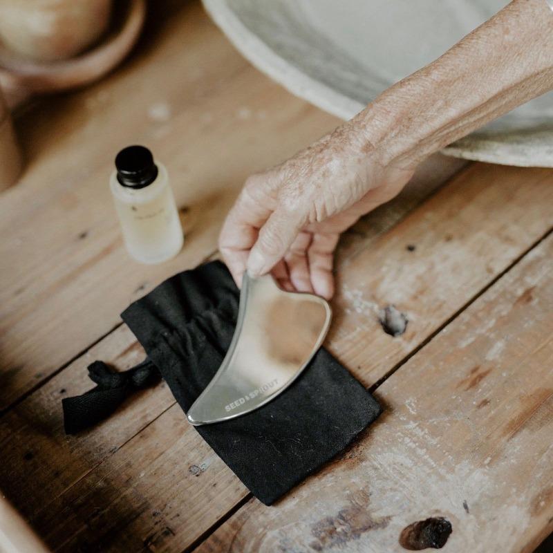 - 1 x Stainless Steel Gua Sha Tool in GOTS Organic Cotton bag with cotton cleaning cloth.