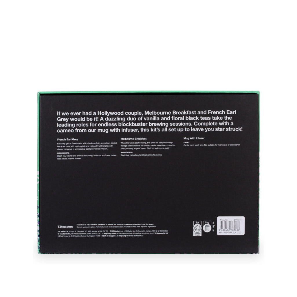A dazzling duo of vanilla and floral black teas take the leading roles for endless blockbuster brewing sessions. Complete with a cameo from our mug with infuser, this kit’s all set up to leave you star struck!