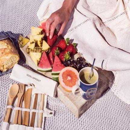 The Seed & Sprout Cutley set is a beautiful-looking, hard-working set that replaces all that nastiness of takeaway plastic. And it takes the "how will I remember to bring it?" headache out of the scenario by fitting all 7 pieces into a quality, organic cotton pouch.