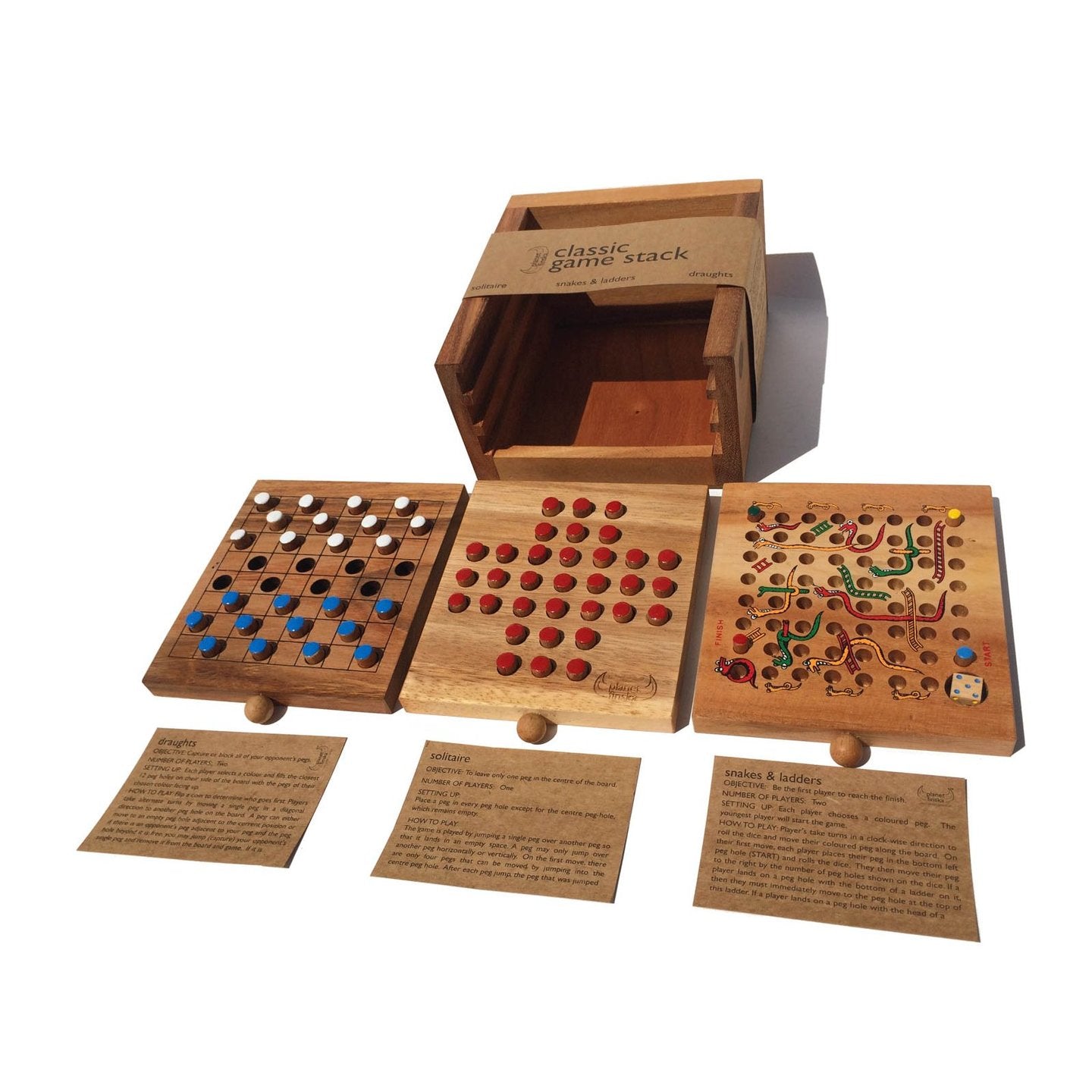 Our three-drawer game stack is beautifully crafted from eco-friendly hardwood and includes easy-to-understand rule cards for each of the classic games.