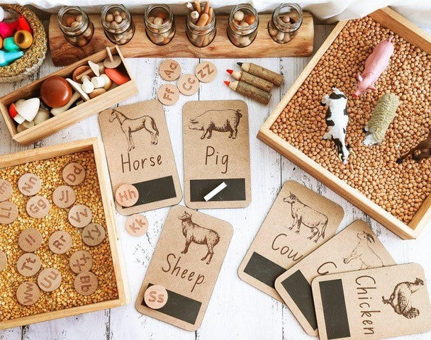 Each card features a picture of an animal with its name engraved beneath it, in clear print for easy reading & copying. Below this, is a chalkboard area, where the child can write the name of the animal as well. Perfect for recognition and writing skills.