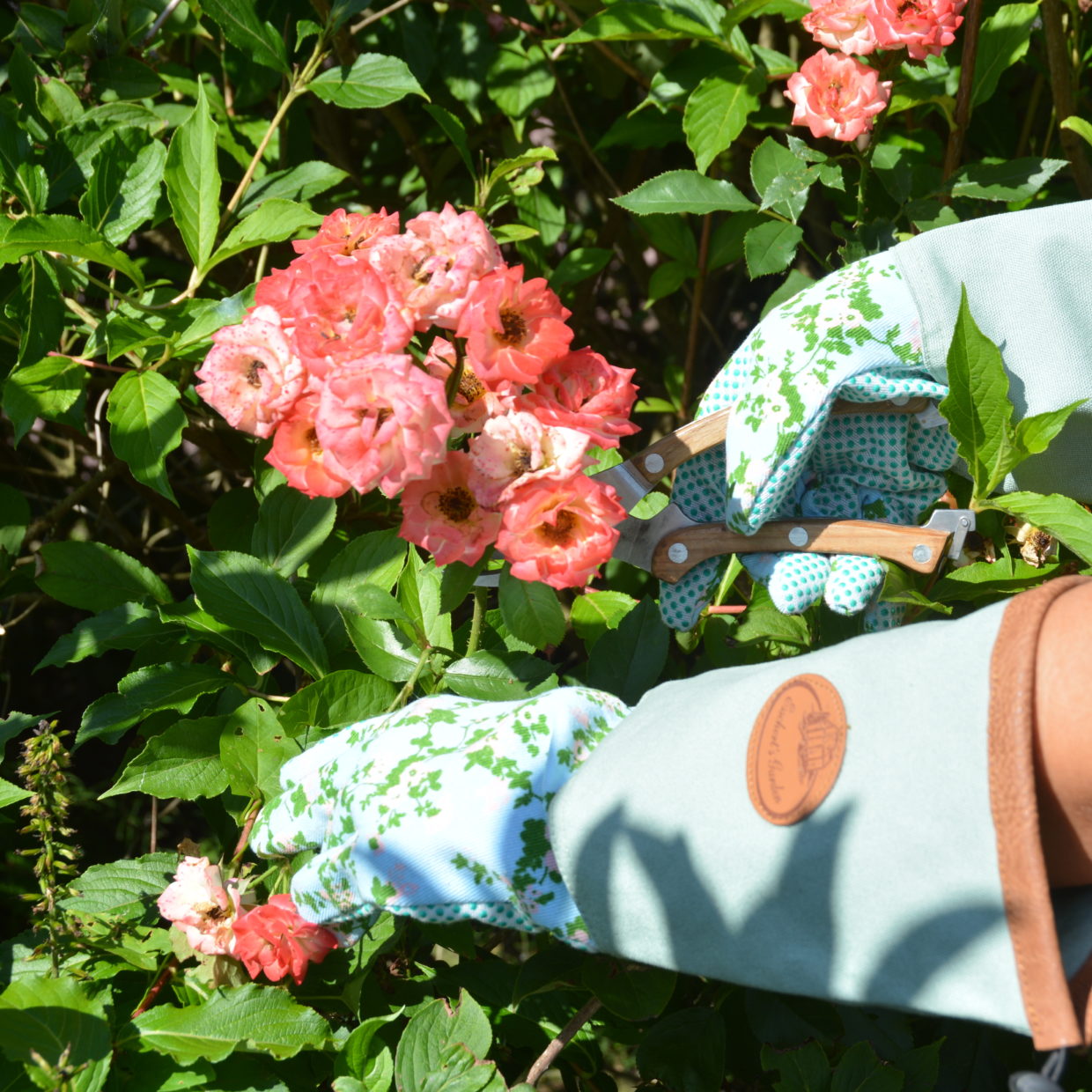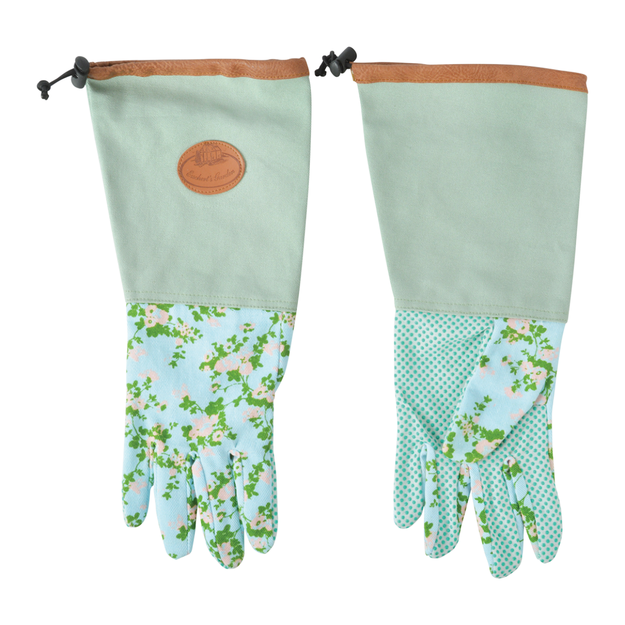 Roses represent beauty, romance and love. The old English pattern with rose print of these gloves is combined with a calming green jute structure. The cuffs of these garden gloves protect the lower arm while pruning roses and shrubbery. The cuffs can be closed with a cord stopper to prevent dirt from getting into the gloves. Additionally the palms come with PVC dots for an improved grip.