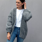 HELLO PARRY's Tobey Hand Knitted Chunky Cardigan is a warm wool blend knit in essential grey.